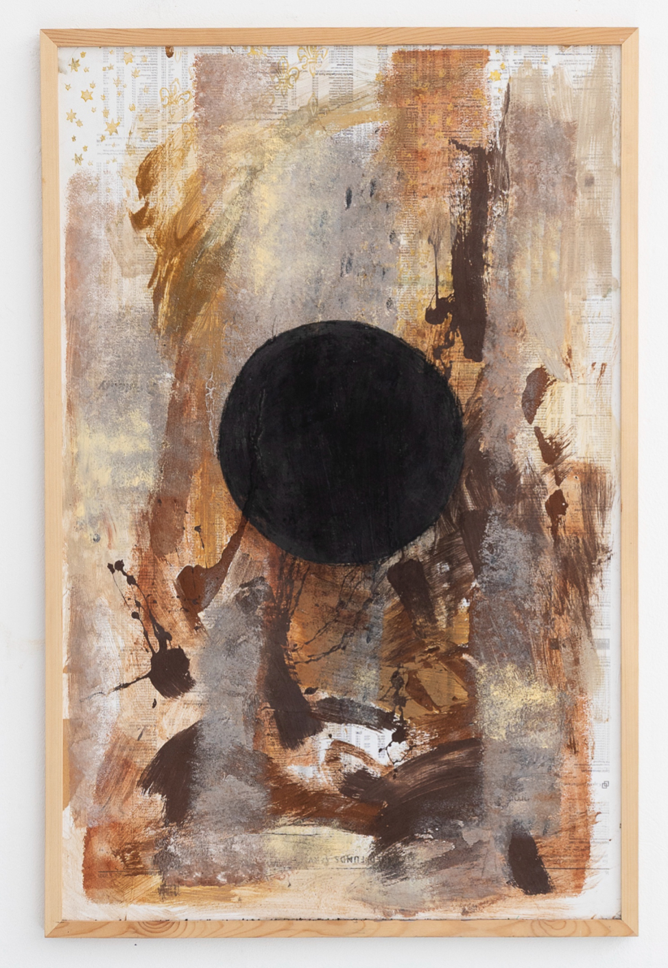Börsenkurse, 2025, Aus der Gruppe von drei Bildern zum Thema „Politik und Börsenkurse, Gewalt und Gewinn“, Collage, 150 x 110 cm, Zeitungspapier, Erde, Acrylbinder, Teer